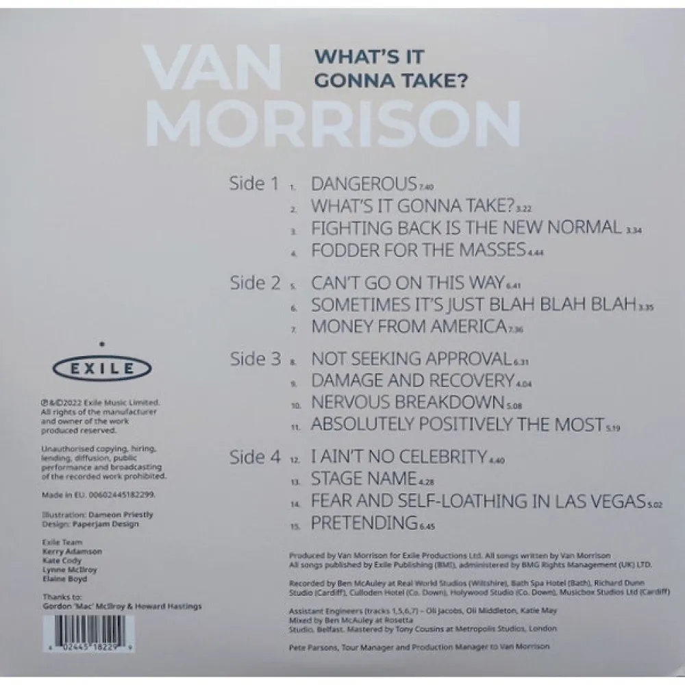 "What's It Gonna Take?" - лимитированное издание студийного альбома 2022 года певца и мультиинструменталиста Вана Моррисона. В альбом вошли 14 новых композиций и записи выступлений певца на живых концертах.