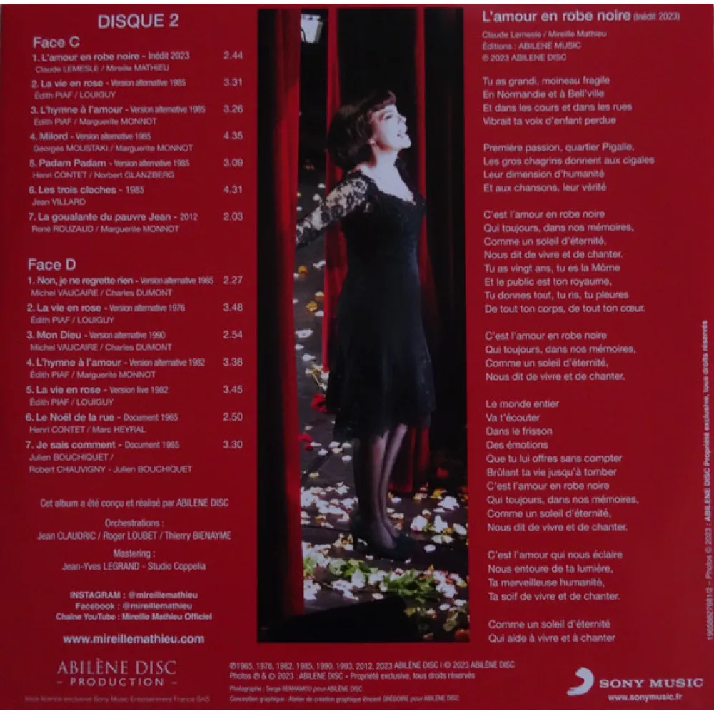 Легендарная Мирей Матье уже почти 60 лет выступает во Франции и за рубежом. Она является послом французского шансона на всех пяти континентах! Певица выпустила этот великолепный двойной альбом, отдавая дань уважения своей любимой певице, великой Эдит Пиаф. Большое дополненное издание содержит альтернативные версии треков и живые выступления.