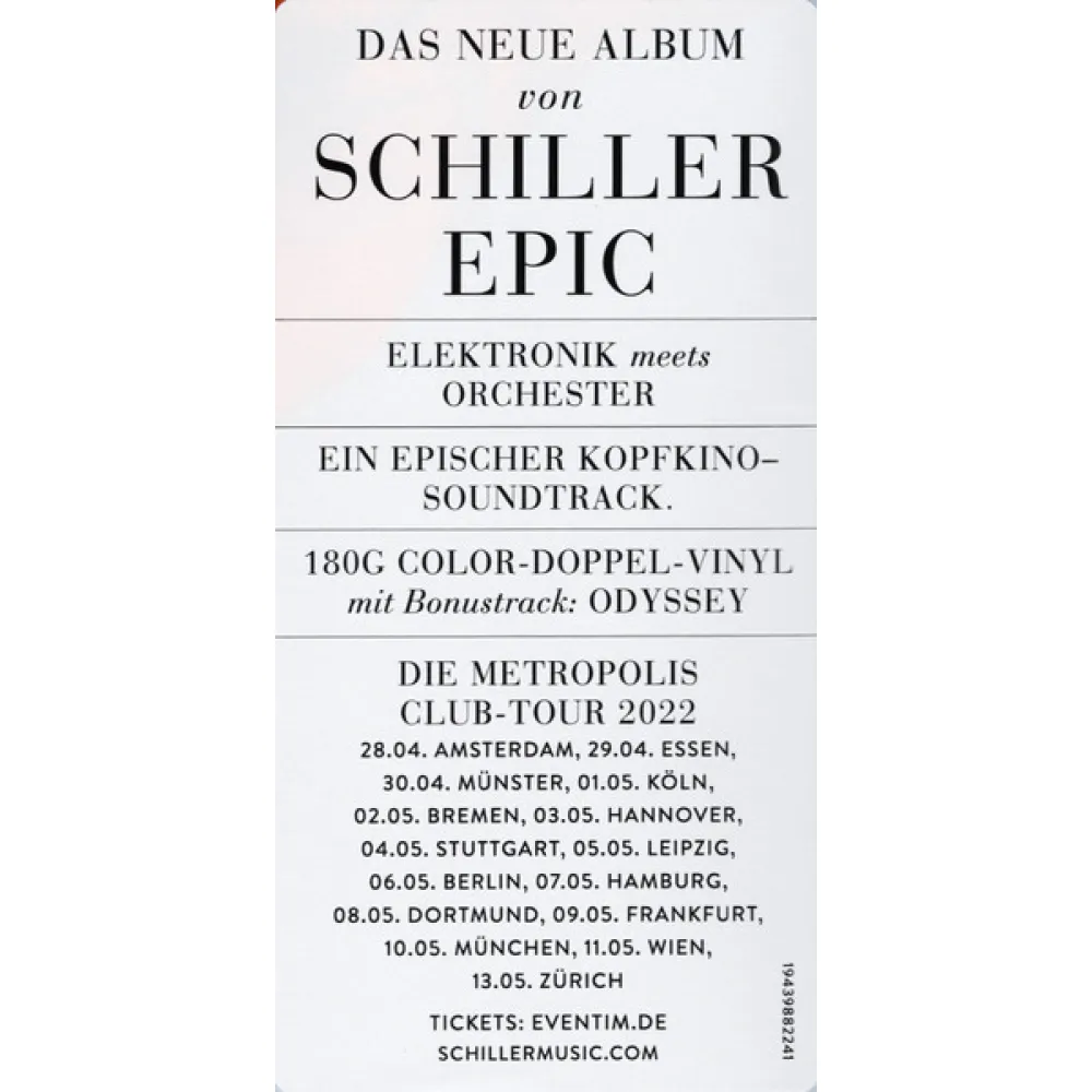 "Epic" - студийная работа немецкого композитора и электронного музыканта Кристофера Фон Дейлена, более известного как Schiller. Как и следует из названия, альбом Epic вдохновлен эпической музыкой для кинофильмов и представляет собой авторский взгляд Кристофера фон Дейлена на жанр саундтреков. Впервые в своей карьере Schiller, большой поклонник кино и музыки, привлек для работы над альбомом оркестр в полном составе.