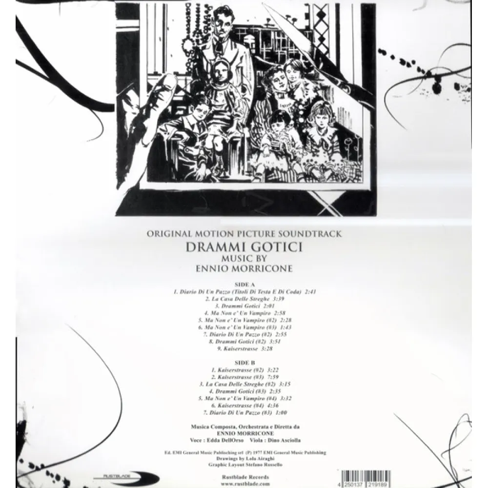 Drammi Gotic» — редкая телевизионная музыка (до популярной «Американской готики»), которая ВПЕРВЫЕ доступна на виниле! Ограниченный винил поставляется с обложкой, на которой изображена оригинальная картина Лолы Айраги (редактор Серджио Бонелли). Drammi Gotici представляет собой настоящий авангард и эксперимент, который маэстро создал для этого саундтрека. Резкие скрипки, устрашающие вокалы и тревожные хоры сопровождают вас в галлюцинаторном путешествии в ужас. Однозначно, одна из самых важных, малоизвестных и экспериментальных композиционных вершин маэстро Морриконе.