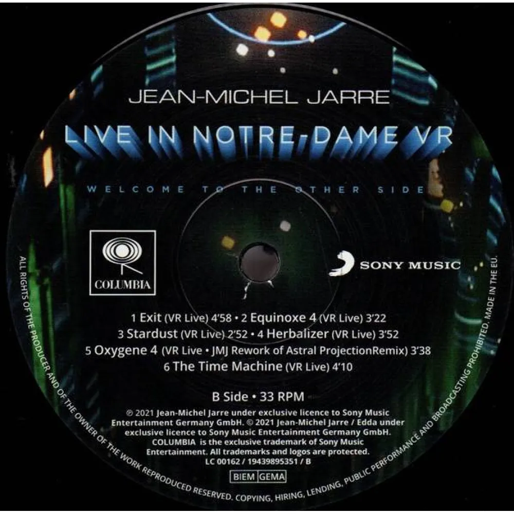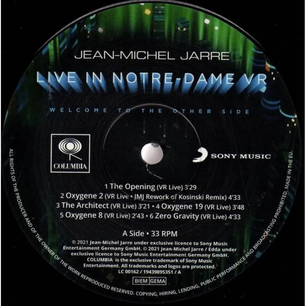 Виниловая пластинка Jean-Michel Jarre - Welcome To The Other Side (Live In Notre-Dame VR) - концертный альбом современного классика и пионера электроники Жана-Мишеля Жарра. В альбом войдут композиции с недавнего альбома музыканта Electronica, номинированного на «Грэмми», а также переработанные вещи с культовых пластинок Oxygene и Equinoxe; все они были сыграны и записаны на триумфальном новогоднем концерта Жарра в парижском соборе Нотр-Дам.