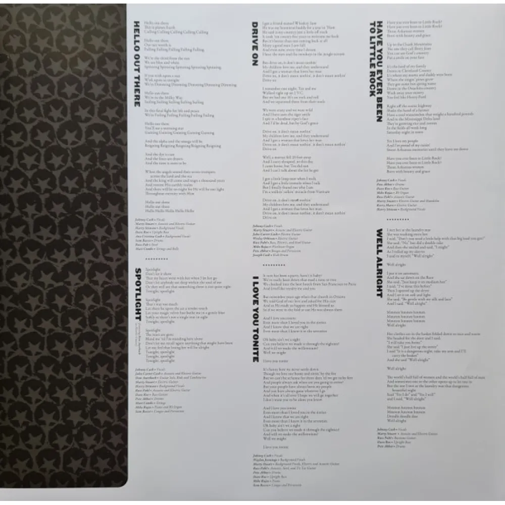 Джонни Кэш – американский певец и композитор-песенник, ключевая фигура в музыке кантри, является одним из самых влиятельных музыкантов XX века. Несмотря на то, что в первую очередь его признали иконой кантри, исполнение песен в таких жанрах как госпел, рок-н-ролл и рокабилли – не редкость. Благодаря своей музыке, стилю жизни на сцене и вне её заслужил авторитет среди большого круга любителей музыки, далеко за пределами жанра кантри. Сам себя позиционировал как исполнителя "христианского кантри". С Джонни Кэшем ассоциируется устойчивое словосочетание "Человек в чёрном", поскольку с 1960-х годов для него было характерно ношение тёмной одежды (причины этого он поясняет в тексте одноимённой песни "Man in Black" 1971 года)