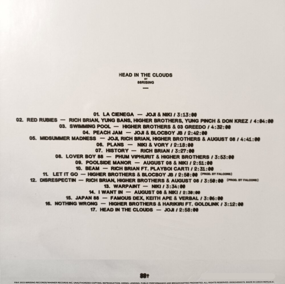Виниловая пластинка 88rising – Head In The Clouds (5 Year Anniversary) (LIMITED WHITE VINYL) (2LP) является первым совместным релизом 88rising crew и запоминающимся летним хитом Midsummer Madness. В сентябре они даже провели свой собственный фестиваль в Лос-Анджелесе.