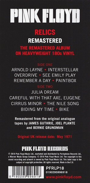 Новое ремастированное переиздание на 180-граммовом виниле первого сборника "Relics" группы Pink Floyd, вышедшего в 1971 году. Ремастеринг был сделан Джеймсом Гатри, Джоэлем Плантом и Берни Грундманом в 2018 году. Переиздание выходит спустя почти 50 лет с момента появления первого тиража.
