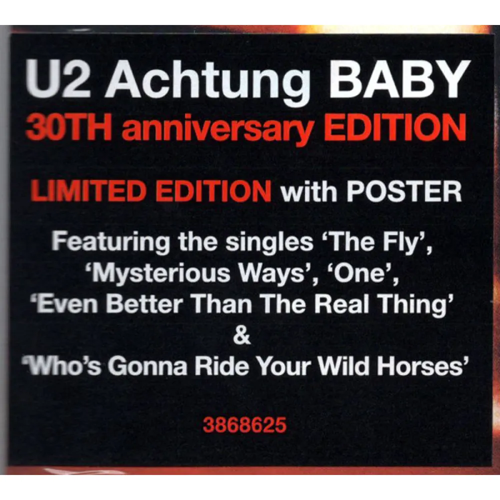 Лимитированной юбилейное переиздание альбома "Achtung Baby" от U2. Спродюсированный Даниэлем Ланоисом и Брайаном Ино и записанный на берлинской студии Hansa "Achtung Baby" был выпущен в 1991 году и считается одним из самых успешных альбомов группы. В него вошли пять популярных синглов: "The Fly", "Mysterious Ways", "One", "Even Better Than The Real Thing" и "Who’s Gonna Ride Your Wild Horses".