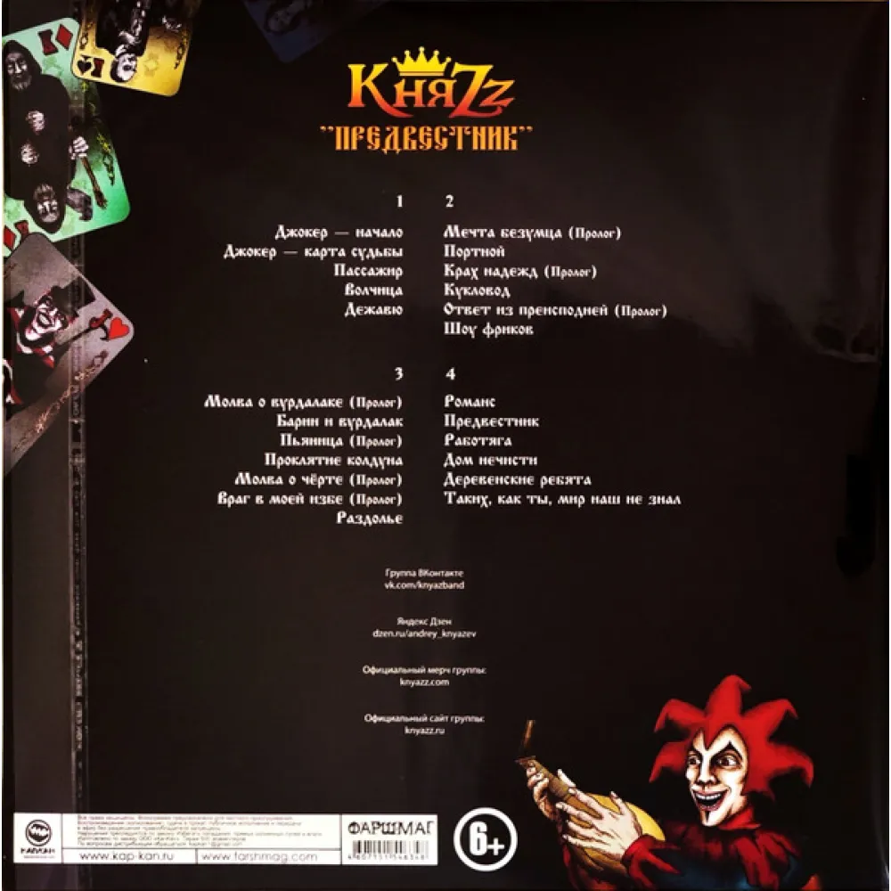 "Предвестник" - пятый студийный альбом участника легендарной группы Король и Шут, питерского рок-музыканта Андрея Князева и его коллектива КняZz. Он был выпущен в 2015 году. Все песни были написаны Андреем Князевым в разное время с 1991 по 2010 год. Альбом стал наиболее продолжительным в дискографии коллектива: 17 песен, а также пять стихотворений и две диалоговые сценки ("молвы"), предваряющие песни, наподобие альбома группы Король и Шут "Жаль, нет ружья" (2002). Треки "Джокер — начало" и "Джокер — карта судьбы" - это предыстории к песне "Джокер" группы Король и Шут, а композиции "Портной", "Кукловод", "Шоу фриков" и прологи к каждой из них образуют трилогию.