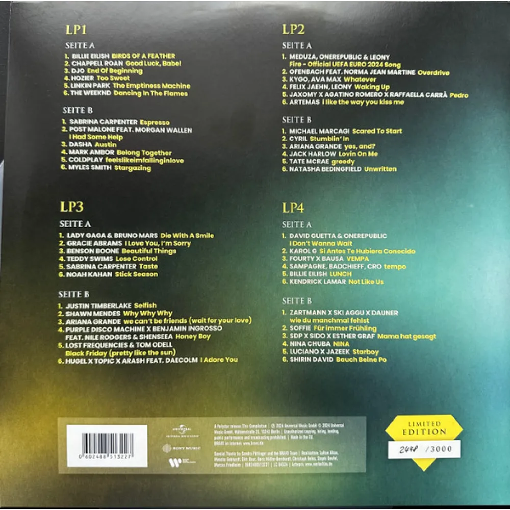 "BRAVO - The Hits 2024" находится на старте и представляет нам самые большие хиты и самые популярные синглы. В него вошли такие международные группы и исполнители, как Billie Eilish, Linkin Park, Hozier, Coldplay, Justin Timberlake и Ariana Grande, а также немецкие новички и звезды, такие как Shirin David, Zartmann и Nina Chuba.