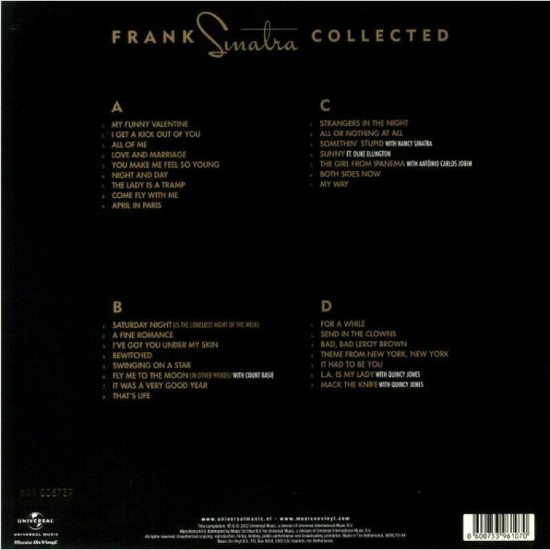 Сборник Frank Sinatra Collected посвящен его карьере и музыкальному наследию на 2 LP, охватывающих 5 десятилетий. В сотрудничестве с Frank Sinatra Enterprises 31 запись на Collected включает не только его самые известные песни, но и некоторые из его лучших альбомных треков и совместные работы с Каунтом Бэйси, Куинси Джонсом и его дочерью Нэнси - все это показывает, каким разносторонним артистом он был.
